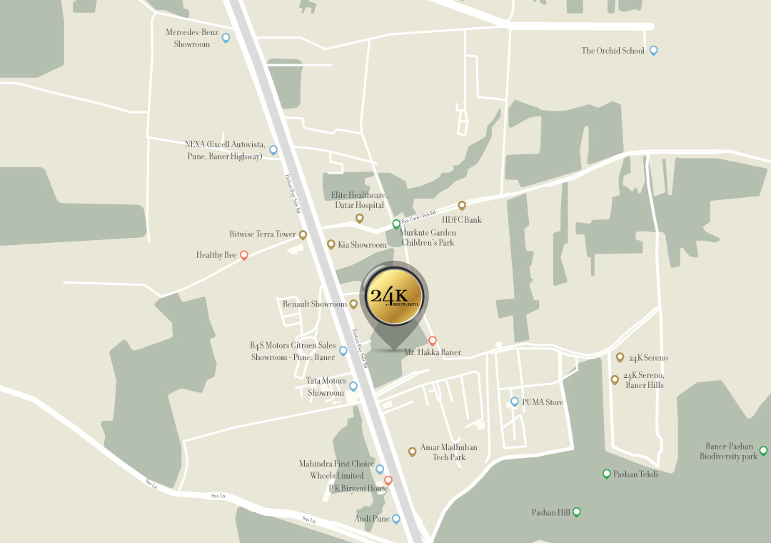 Located in the upscale neighborhood of Baner with seamless access to NH 48, 24K Altura ensures excellent connectivity across Pune. Renowned schools, hospitals, shopping centers, and business hubs such as Jupiter Hospital, Balewadi High Street, Xion Mall, and The Orchid School are nearby. The project is also just 20 minutes from Rajiv Gandhi IT Park, adding to everyday convenience.